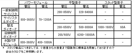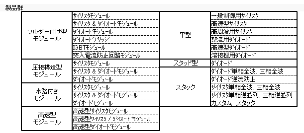 製品構成は、電力用ダイオード、サイリスタ及びIGBTです。